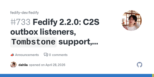 arrow-up14arrow-down1external-linkFedify 2.2.0: C2S outbox listeners, Tombstone support, SolidStart and Nuxt integrations, and three new tutorialsplus-squaregithub.com洪 民憙 (Hong Minhee)@lemmy.mlEnglish · 9 hours agomessage-square0linkfedilink